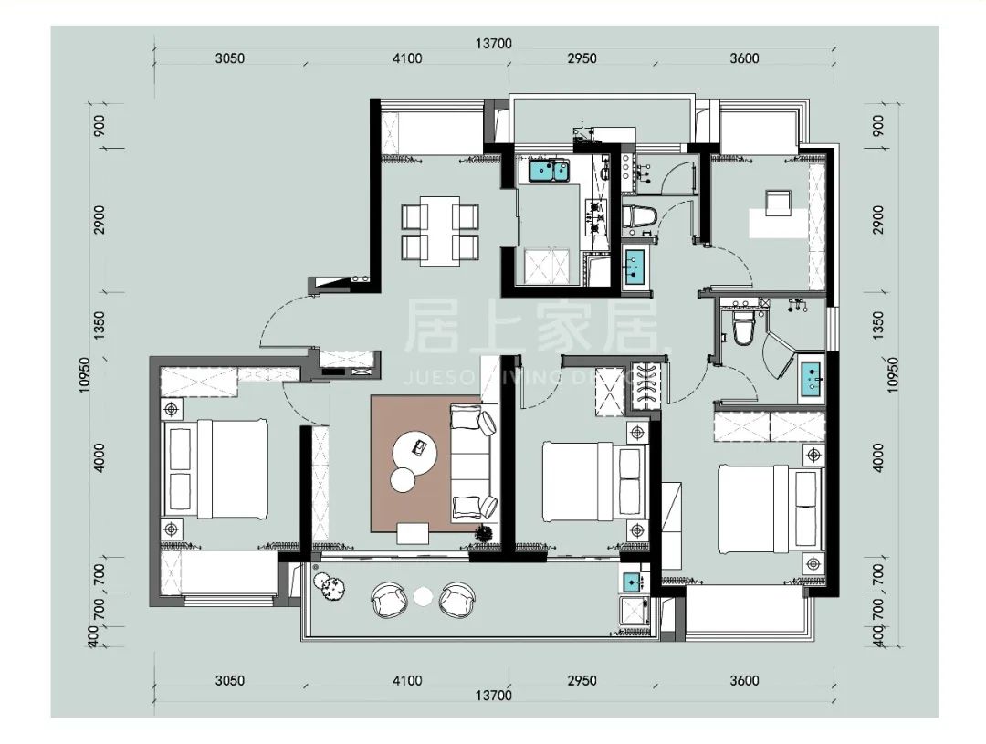 与第一稿方案有所不同的是,将客厅阳台空间打通,整体空间更加开阔;餐厅增加卡座,卡座一般靠墙或在角落,其占用空间比椅子少,必要时可以坐更多的人,还能增加收纳空间。北次卧作为客卧,设计为榻榻米+衣柜+书桌结合的形式。